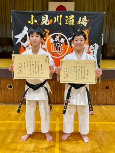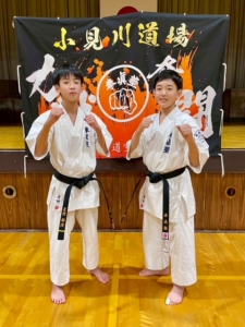 小見川道場👊初段審査合格者紹介 2025年11月22日 小見川道場 令和7年9月に行われた初段審査にて、 小見川道場から2名が挑戦し見事合格!! しました。 長い間、地道な努力を重ねてきた成果が 実を結び、見事に黒帯(初段)を 手にしました。 黒帯はゴールでは無く、新たなスタートライン だと思います。 これからも、初心を忘れずに空手道に 精進してください! 黒帯おめでとうございます✨ (写真左) 星野 裕清君(中1) (写真右) 篠塚 一輝君(中1)